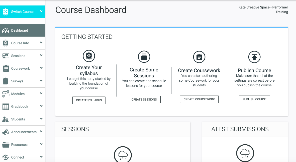 Once you have created an account and profile, you will be taken to the Course Creation Dashboard page. Here you will see a “Getting Started” checklist. This checklist guides you through the KVS set up process. You can return to any section on the checklist via the “Dashboard” tab on the left-side navigation menu.