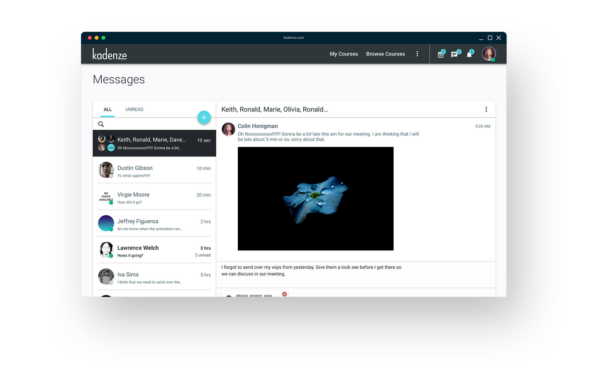 Messenger is Kadenze's direct messaging system. The Messenger allows image/file uploads, unlimited conversations, and group chats up to 50, so you can form study groups, workshop projects, or just hang out.